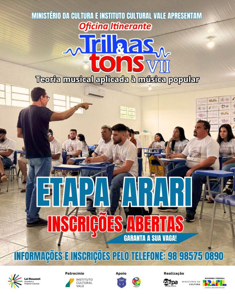 A quarta etapa da 7ª Edição da Oficina Trilhas e Tons ocorreu na cidade de Arari, no Maranhão, de 7 a 11 de julho de 2025, com 33 alunos inscritos.