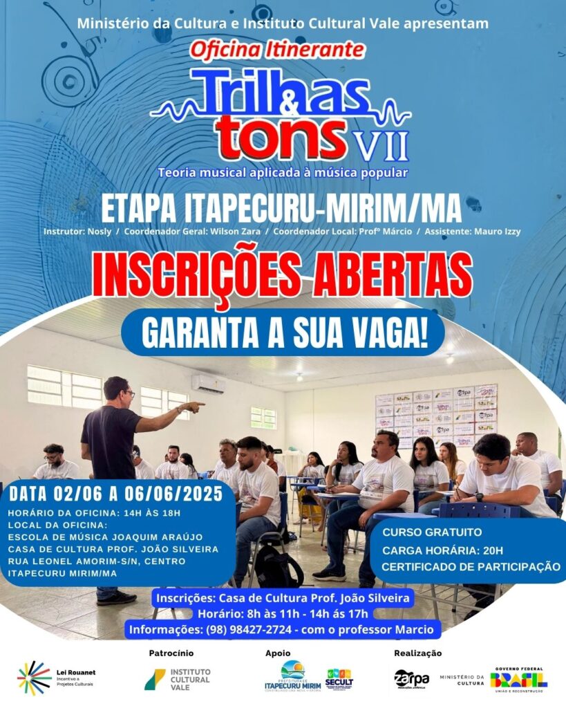 A segunda etapa da 7ª Edição da Oficina Trilhas e Tons ocorreu na cidade de Itapecuru-Mirim, no Maranhão, de 2 a 6 de junho de 2025, com 40 alunos inscritos.